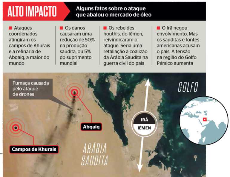 A escalada é um desafio para Trump. Depois de abandonar o acordo nuclear internacional com o Irã, os EUA têm ampliado suas sanções econômicas que visam estrangular as exportações de petróleo iranianas. O Golfo Pérsico, que concentra um terço das exportações mundiais de petróleo, registra tensões crescentes desde o ano passado e tornou-se palco de ataques. O incidente expôs a vulnerabilidade da Arábia Saudita em proteger suas instalações, apesar de o país ser um dos maiores compradores mundiais de armamentos — a maior parte fornecida pelos EUA. Seu papel como regulador do mercado mundial passou a ser visto com reserva. Isso pode atrair o interesse pela exploração em áreas mais seguras, o que pode favorecer indiretamente o Brasil, com o pré-sal adquirindo mais importância como fronteira estratégica da commodity.