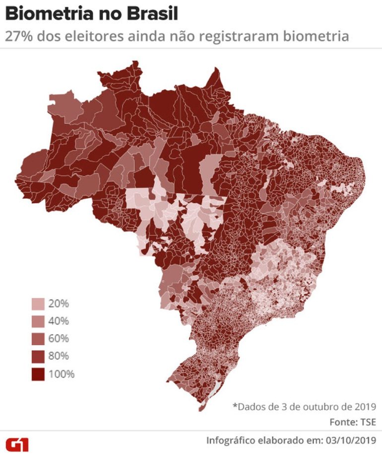 Dados do Tribunal Superior Eleitoral (TSE) revelam que 27% dos eleitores ainda não fizeram o cadastro biométrico no Brasil. Parte deles terá o título cancelado caso não faça a coleta de impressões digitais e a atualização de dados até maio de 2020, já que a biometria será obrigatória em várias cidades do país. O 1º turno das próximas eleições será realizado daqui a um ano, em 4 de outubro de 2020.
