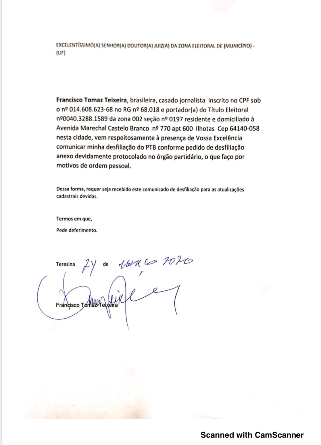 OBS: ESPERO QUE O PTB TENHA A DIGNIDADE DE ENCAMINHAR COM URGÊNCIA AO TRE A MINHA DESFILIAÇÃO, POIS JÁ ESTOU COMUNICANDO Á JUIZA DA MINHA ZONA ELEITORAL.