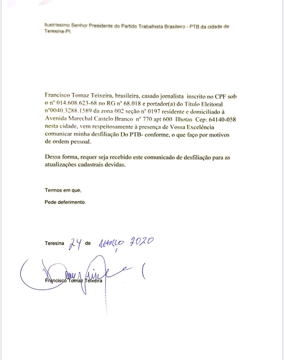 Alegando que o PTB do Piauí não tem definição política, de lado, nem oposição e sempre bajulando o Poder, o jornalista Tomaz Teixeira, autoproclamado Prefeito de Teresina, decidiu achar melhor ficar sem partido, do que servindo de sanduíche dos dois lados políticos Governo e oposição. O PTB não se define, não tem projeto nenhum para Teresina e nem para o Piauí, não merecendo que figuremos em um time que não joga com fidelidade aos seus filiados e aos seus eleitores. A partir desta data, comunico o meu desligamento do PTB, preferindo ficar sem sigla, ou usando o termo direto: SEM PARTIDO!! O Jornalista Tomaz Teixeira autoproclamado Prefeito de Teresina, com 33 projetos definidos de desenvolvimento, para mudar Teresina, e dar orgulho à família teresinense, que padece a falta de criatividade e competência, no comando dos destinos de nossa capital. Nossos projetos e propostas são de alto nível como sempre pregava e falava o grande pensador e criador Alberto Silva meu eterno GURU POLÍTICO, com quem aprendi a ter visão futurista e empreendedora. Sem arrependimento e pedindo desculpas pela minha infeliz escolha, agora, abolida do meu currículum. Agora sou Prefeito autoproclamado de Teresina sem partido. Abraço sincero: Tomaz Teixeira.
