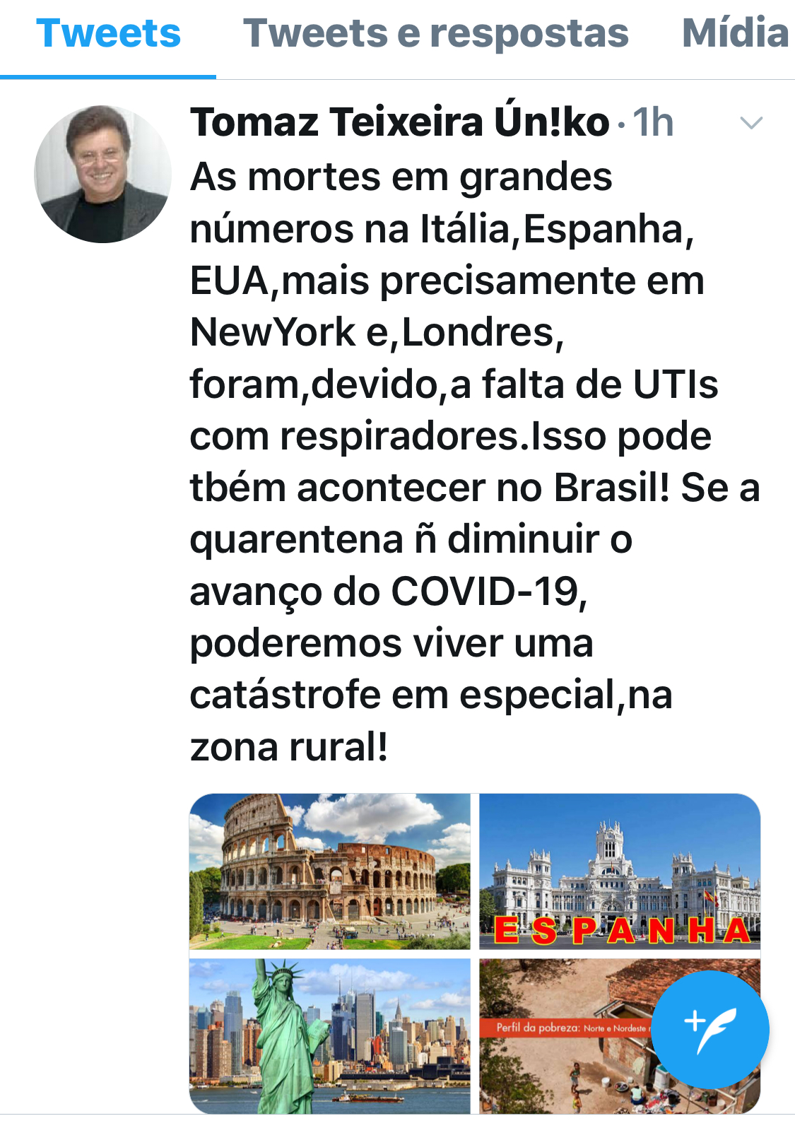 OBS . O Brasil, a exemplo da Itália, Espanha, EUA e outros, correm contra o tempo, no Brasil Graças a Deus ainda vai dar tempo gerar uma estrutura de leitos de UTI como vem fazendo São Paulo, pois o país, não estava preparado como não estavam os americanos e ingleses, para a grande necessidade de leitos de UTIs, com os imprescindíveis respiradores. Seja o que Deus quiser, mas, se chegar, no sertão do país, sem leitos de UTIs, vai ser uma catástrofe. Que Deus nos proteja!!