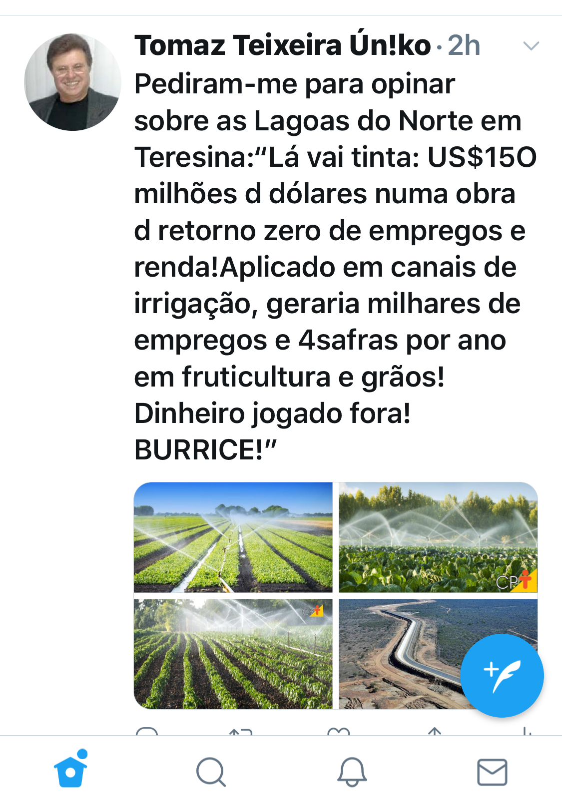 - A CAPITAL DO PIAUÍ, não pode continuar sendo a mais atrasada do nordeste, em produção rural de frutos, legumes, fruticultura e verduras, pois, até hoje, nenhum de seus governantes, atinou para o fato de que Teresina é uma rica mesopotâmia, clamando, gritando por projetos de irrigação. Esses candidatos só têm projetos pessoais de querer ser tudo deputado, prefeito, mas, para ser Prefeito, com projetos e propostas, convincentes, eles não estão preparados. Acreditem!! Alguém tem? Por que a imprensa não cobra deles? Candidatos sem propostas de desenvolvimento? Como são despreparados e neófitos. E a imprensa fica atrás, por não ter competência para cobrar por falta de uma linha editorial, direcionada ao progresso e ao desenvolvimento.
