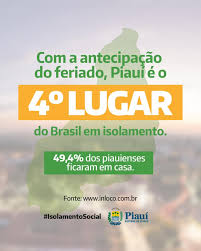 Segundo relatório do “Inloco”, Jatobá do Piauí (68,3%) e Cocal de Telha (64%), no Norte do Piauí, foram as cidades com melhor desempenho de isolamento. A capital Teresina alcançou índice de 52,6% da população em casa.