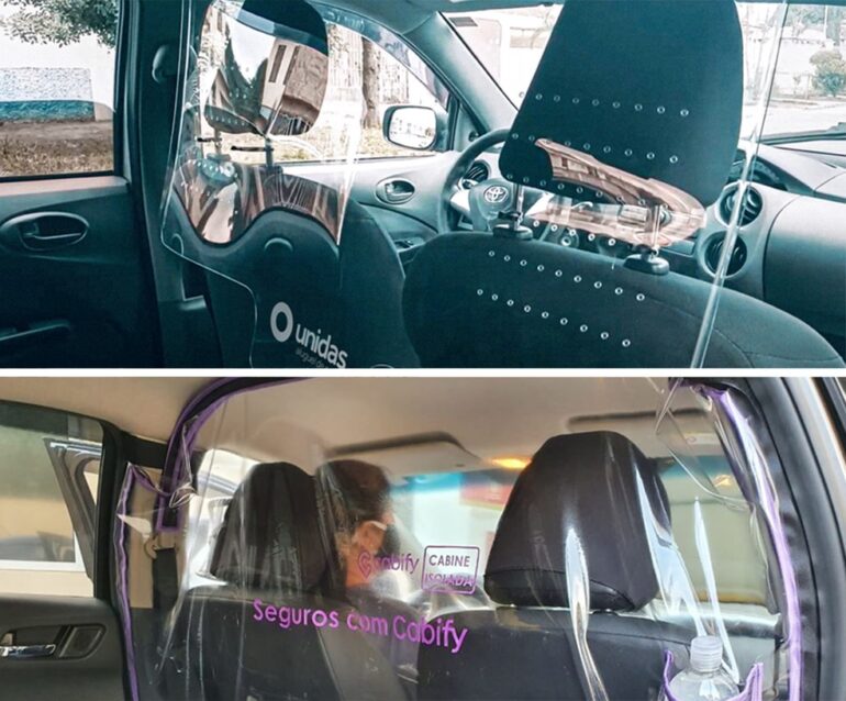 Em meio à pandemia, Unidas e Cabify criaram variedades de película para a instalação entre os assentos dianteiros e traseiros dos veículos. A divisória ajuda a proteger contra a Covid-19, afirmaram infectologistas entrevistados pelo G1.