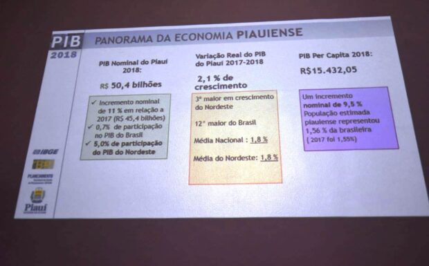 De acordo com o panorama nacional, o PIB do Brasil cresceu em 1,8% em 2018, um pouco maior do que a alta de 2017, que foi de 1,3%. No Piauí, a instituição que faz parceria com o IBGE é a Secretaria do Planejamento (Seplan), por meio da sua diretoria de estudos e pesquisas socioeconômicas.