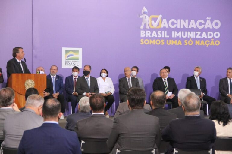 O governador Wellington participou da cerimônia de lançamento do Plano Nacional de Imunização contra a Covid-19, realizada no Palácio do Planalto, em Brasília. A vacinação no Brasil deve ser concluída em 16 meses – quatro meses para vacinar todos os grupos prioritários e, em seguida, 12 meses para imunizar a “população em geral”.