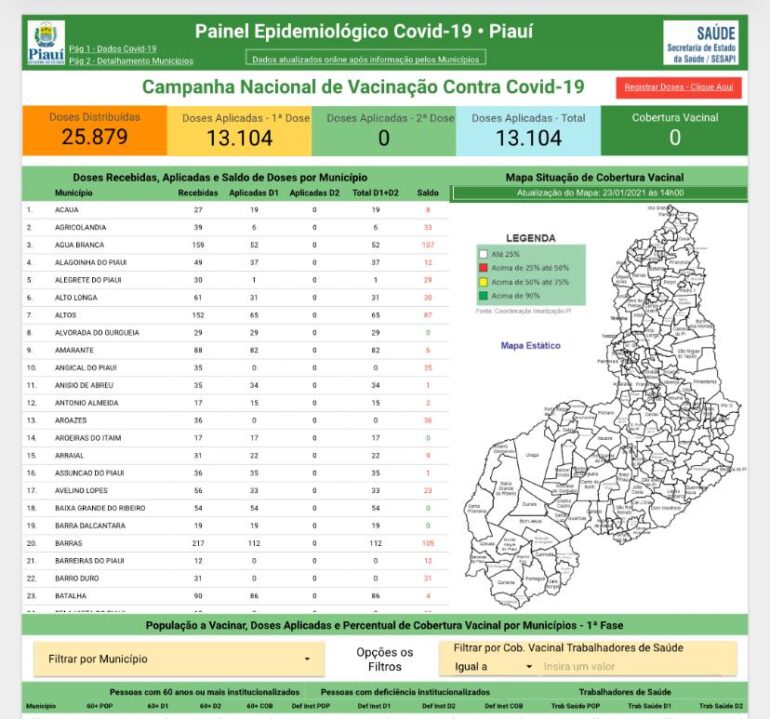 Para garantir a transparência dos dados relacionados ao enfrentamento à pandemia no Piauí, o Governo do Estado, por meio da Secretaria de Estado da Saúde (Sesapi), disponibiliza, a partir desta segunda-feira (25), o vacinômetro, ferramenta para acompanhar a evolução da campanha de vacinação contra a Covid-19. De acordo com a ferramenta, 13.113 pessoas já receberam a primeira dose da CoronaVac na estado.