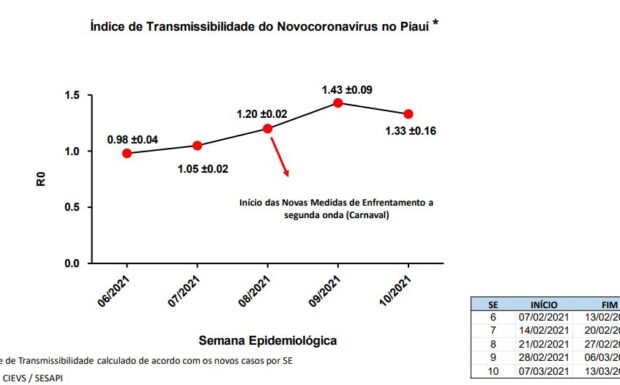 As medidas adotadas para conter a segunda onda de propagação da Covid-19 no Piauí, começam a surtir efeito. O índice de transmissibilidade do novo coronavírus caiu, após a adoção das restrições ampliando o distanciamento social. Segundo relatório elaborado pela Secretaria de Estado da Saúde Sesapi na semana epidemiológica 10 (7 a 13 de março) o índice de transmissibilidade verificado foi de 1,33, uma sensível queda no comparativo com a semana anterior, que registrou índice 1,43.