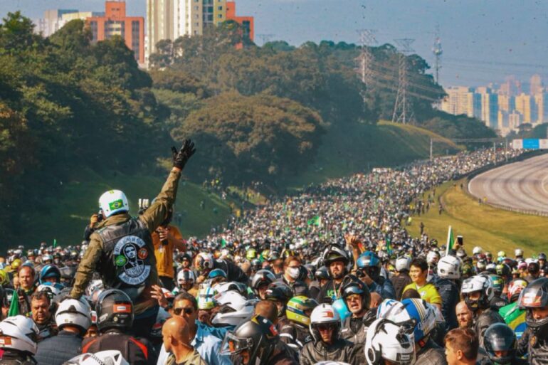 O presidente Jair Bolsonaro participou neste sábado, 12, de uma ‘motociata’ nomeada ‘Acelera Para o Cristo’, organizada por simpatizantes evangélicos de Bolsonaro e por motociclistas. O ato é semelhantes aos já realizados no Rio de Janeiro e Brasília nas últimas semanas. Cerca de 300 mil pessoas são esperadas. Para evitar possíveis problemas durante o passeio, o governo estadual informou que o esquema de segurança foi reforçado. Bolsonaro está acompanhando do ministro do Meio Ambiente, Ricardo Salles. O grupo percorreu um trecho da Rodovia dos Bandeirantes, onde Bolsonaro parou por alguns instantes para acenar e cumprimentar quem o acompanhava no trajeto. Em seguida, retornaram à capital paulista e o ato se encerrou no Obelisco do Ibirapuera, onde Bolsonaro discursou. O presidente discursou durante cerca de 30 minutos e afirmou que ‘não existe pátria mais abençoada e mais rica do que a nossa’. Ele lamentou as mortes devido ao coronavírus, mas disse que só deve ficar em casa quem tem comorbidades ou idade avançada. “O resto, o povo tem que trabalhar”. Bolsonaro também reforçou o uso de medicamentos como hidroxicloroquina e ivermectina como ‘tratamento precoce’ contra a Covid-19.