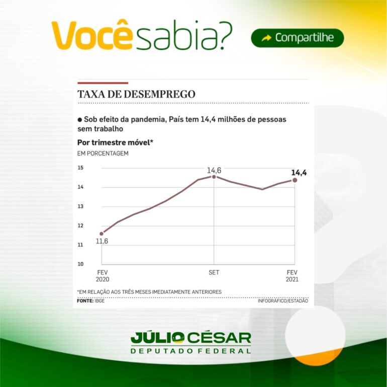 A taxa de desemprego no Brasil no período da pandemia do Covid. O desemprego atingiu 14,4% da força de trabalho. O número é o maior desde o início da série histórica, em 2012. As maiores taxas de desemprego no primeiro trimestre foram registradas em Pernambuco e Bahia – 21,3%. O Piauí que chegou a 12% no quarto trimestre de 2020, subiu para 14,5% no primeiro trimestre de 2021. Os dados são do IBGE.