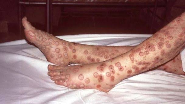 As erupções mudam e passam por diferentes estágios, podendo parecer catapora ou sífilis, até finalmente formarem uma casca, que cai posteriormente — Foto: UKHSA via BBC