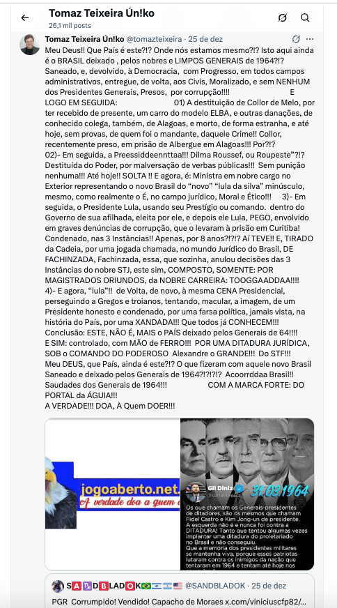 O Presidente Lula da Silva, tem até o dia 30, de Dezembro, para, corrigir, essa sua sanha odienta, de COMUNISTA, ( “É MENTIRA TERTA: VERDADE NAPOLEÃO!!!) como ele LULA, realmente, o é, e não tem negado à ninguém, contra militares, de nossas 3 armadas, claro, defensores maiores e ferrenhos, de nossa Pátria, e, de nossa Democracia.