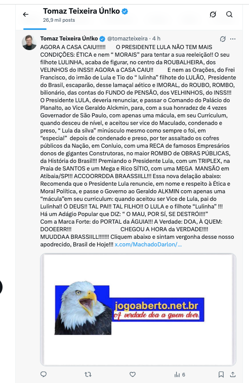 - – Jornalismo sério, é aquele, que alerta os políticos de seus erros, e de seus familiares, pois, se assim continuar, o Presidente “lula da silva”, dificilmente, terá êxito nessa sua tentativa de reeleição!!