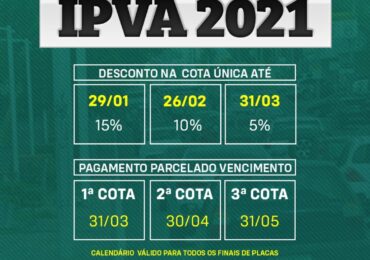 O calendário de pagamento do Imposto sobre a Propriedade de Veículos Automotores (IPVA) 2021 já está disponível. As regras são as mesmas do ano passado com descontos que variam de 15% a 5% no pagam…