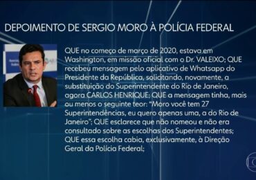 Veja no JN as principais declarações do ex-ministro Sergio Moro no depoimento à PF O ex-ministro da Justiça Sergio Moro afirmou, no depoimento que prestou à Polícia Federal no último sábado (2), qu…
